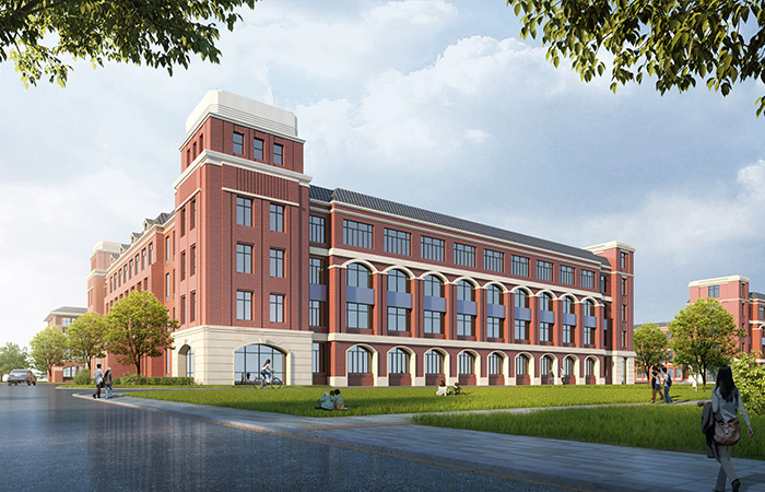 建筑外墻采用磚紅色與米白色相互碰撞映襯,形成典雅靈動的視覺對比,以仿石漆、石材、Low-E中空玻璃為主要裝飾材料,突出建筑精工細作、開拓創(chuàng)新的工匠精神。