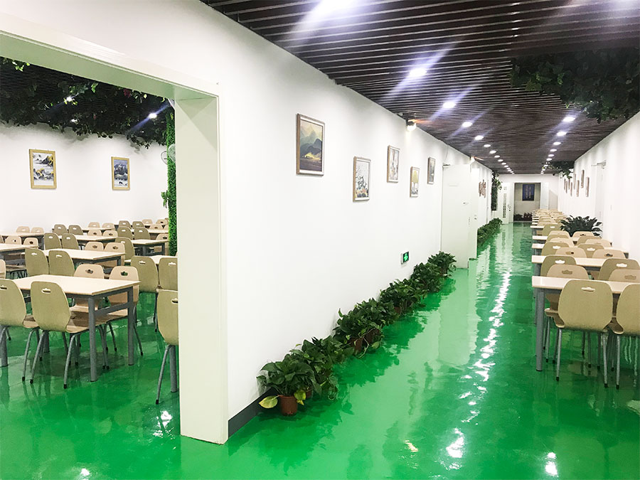 如蔭的綠植,溫馨的燈光,嶄新的桌椅整齊排,小清新的壁畫養(yǎng)人眼消過毒的餐具發(fā)著亮光。